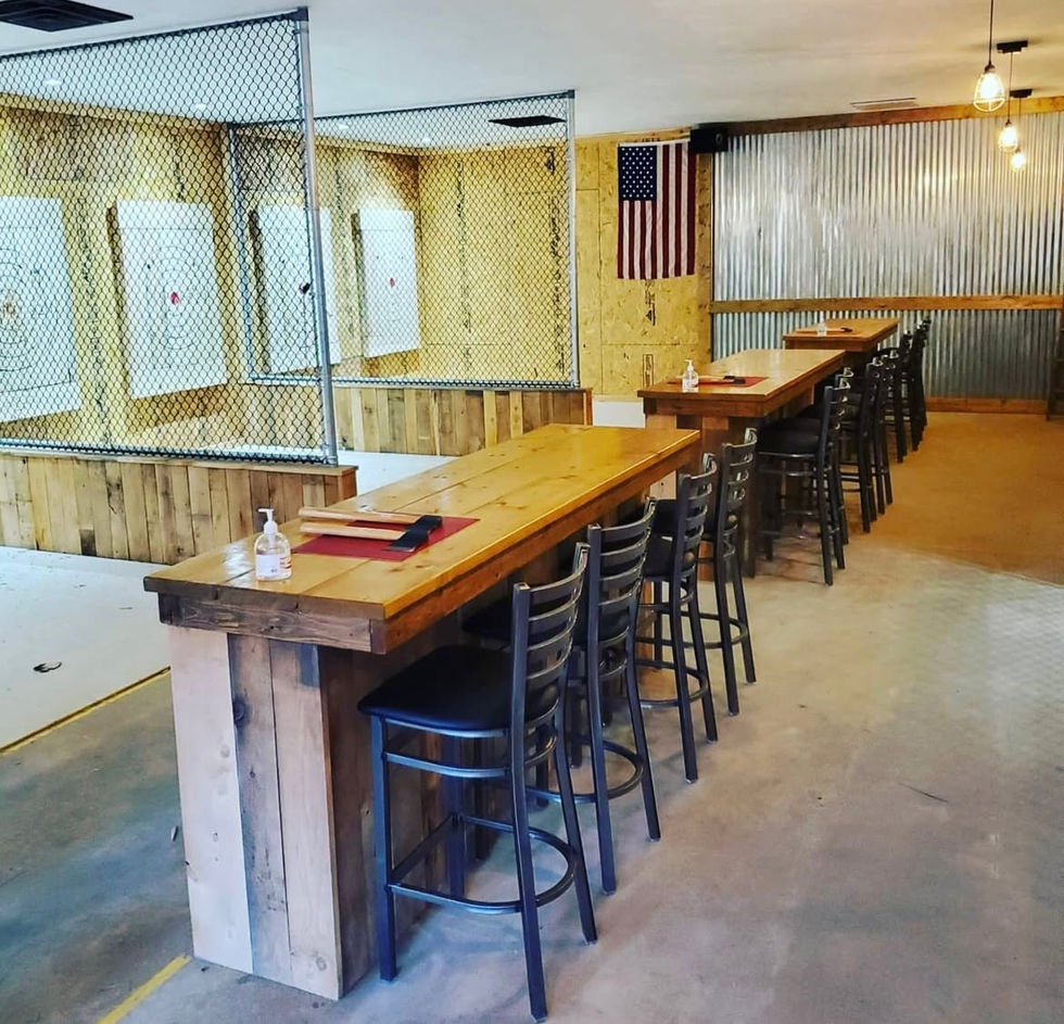 Explore the various facilities of the golf driving range, including a driving range with overcast sky and trees, a wooden structure with green mats, and a rustic indoor axe throwing venue with wooden tables.